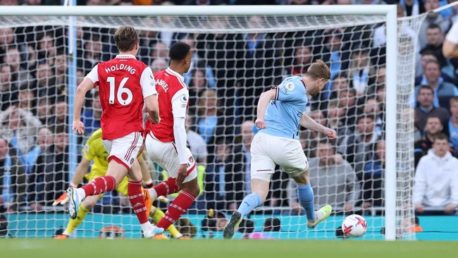 The Citizens memimpin 1-0 di menit ketujuh. Kevin De Bruyne menaklukkan Ramsdale lewat tembakan dari luar kotak penalti yang berawal dari serangan cepat.