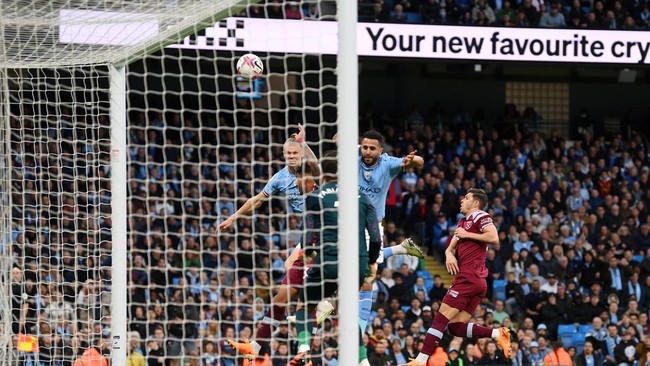 Peluang Man City di menit ke-23 terbuang. Umpan silang Jack Grealish ke tiang jauh gagal dituntaskan dengan baik oleh sundulan Erling Haaland.