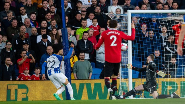 Dua menit berselang giliran Brighton yang membuang peluang emas. Kaoru Mitoma bisa menyerobot umpan Victor Lindelof ke Aaron Wan-Bissaka. Tembakan keras Mitoma masih menghantam kepala David de Gea.