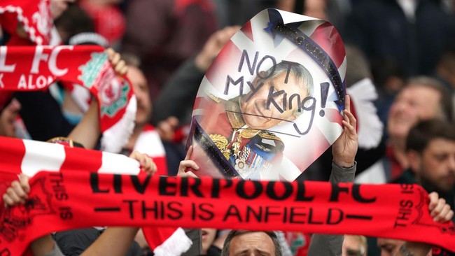 Lagu God Save the King yang berkumandang di Anfield tenggelam ditelan yel-yel dan sorakan dari suporter Liverpool. Aksi itu merupakan bentuk perlawanan terhadap penobatan Charles III sebagai raja baru Inggris.