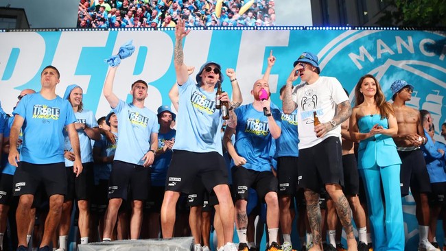 Parade bus terbuka Man City berlangsung Senin (12/6/2023) sore waktu setempat. Kevin de Bruyne cs diarak di jalan-jalan kota Manchester menuju panggung kehormatan di Oxford Street.