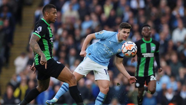 City membuka keunggulan pada menit ketujuh. Julian Alvarez menjebol gawang Brighton usai menuntaskan umpan tarik dari Doku.