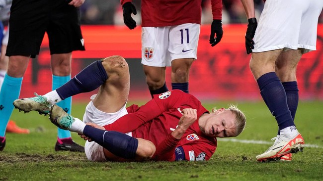 Erling Haaland mengalami cedera saat Timnas Norwegia menjamu Kepulauan Faroe pada laga persahabatan di Ullevaal Stadium, Jumat (17/11/2023) dini hari WIB. Penyerang Man City ini mengalami cedera usai mendarat dalam posisi kurang baik ketika berusaha menjangkau umpan.