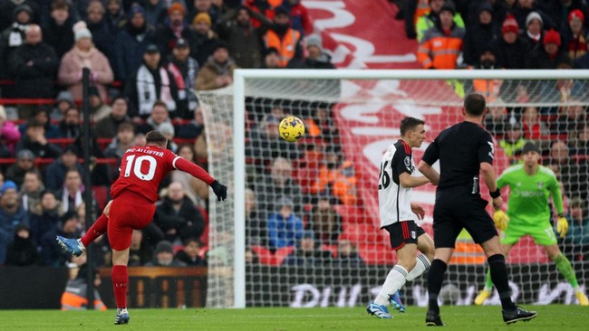 Boom! Liverpool memegang keunggulan lagi pada menit ke-38 ketika kesalahan Raul Jimenez membuang bola malah mengarahkan ke Alexis Mac Allister. Mac Allister dari jarak 30 yard langsung menembak ke pojok kiri atas gawang Leno.
