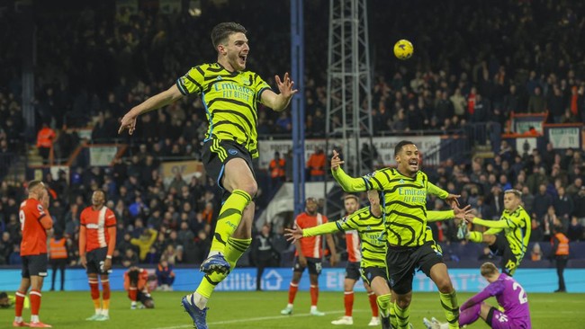 Arsenal menang dramatis saat bertandang ke Kenilworth Road Stadium, Rabu (6/12/2023) dini hari WIB, dalam lanjutan Liga Inggris. Gol menit terakhir di masa injury time dari Declan Rice memenangkan The Gunners 4-3, setelah sempat unggul lalu berbalik tertinggal.