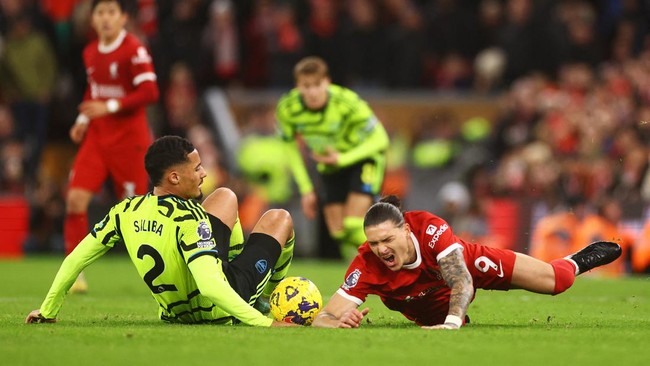 Liverpool vs Arsenal berakhir imbang 1-1 di Anfield, Minggu (24/12/2023) dini hari WIB. Meriam London unggul duluan di menit keempat lewat Gabriel Magalhaes. Mohamed Salah kemudian menyamakan skor di menit ke-29.
