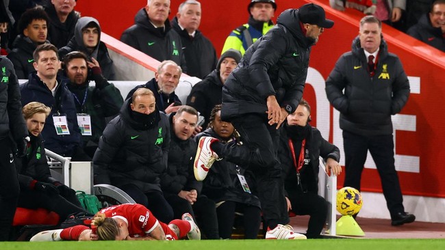 Kostas Tsimikas, yang terguling usai didorong Saka, menabrak bagian kaki Klopp. Sang manajer ambruk, menimpa bek berusia 27 tahun itu.