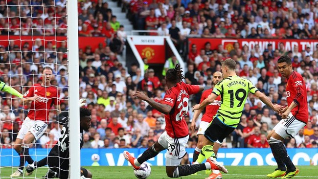 Arsenal menutup babak pertama laga kontra Manchester United dengan keunggulan 1-0 berkat gol Leandro Trossard.
