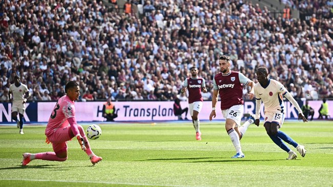 Baru empat menit laga berjalan, Chelsea sudah memimpin 1-0 lewat Nicolas Jackson. Dari situasi free kick, lini pertahanan West Ham terkecoh ketika bola umpan Jadon Sancho menemui Jackson yang melakukan sprint, sebelum menembak ke gawang.