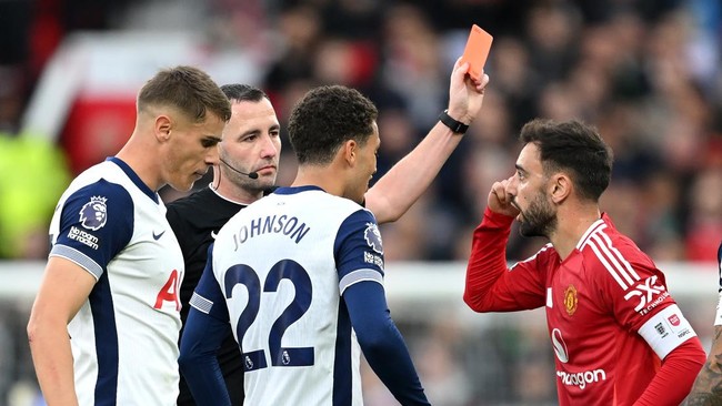 Manchester United disungkurkan Tottenham Hotspur dengan skor 0-3. Manajer MU Erik ten Hag menyebut, kartu merah Bruno Fernandes mengubah permainan.