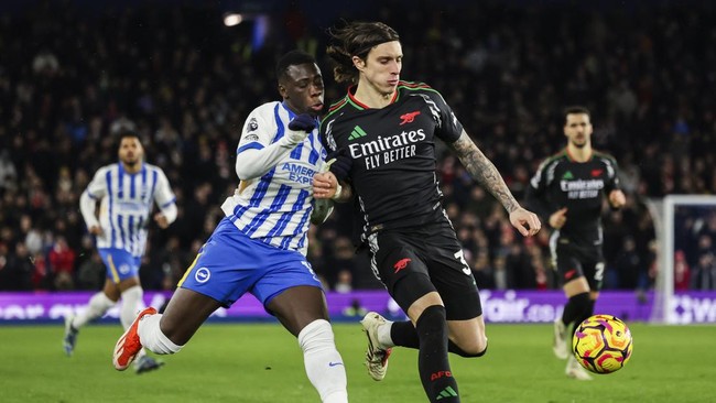 Arsenal ditahan imbang Brighton 1-1 dalam laga di Amex Stadium, Minggu (5/1/2025) dini hari WIB, pada lanjutan Liga Inggris. Gol Ethan Nwaneri pada babak pertama dibalas penalti Joao Pedro setelah turun minum.