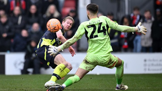 Tuan rumah mengejutkan Man City di menit ke-16. Jamie Donel melepaskan tembakan dari tengah lapangan.