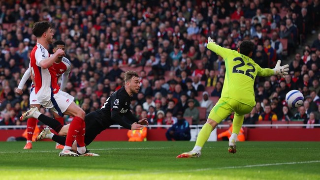 Malahan West Ham menebar nyaman nyata untuk pertama kali. Pada menit ke-18, Tomas Soucek mengalahkan penjagaan Gabriel Magalhaes sebelum menanduk bola meski melambung.