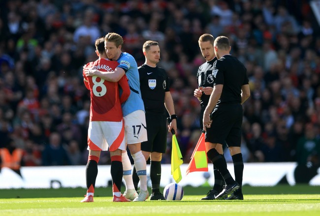 Kapten Manchester United, Bruno Fernandes langsung menyalami Kevin De Bruyne selepas laga tuntas. Berduanya saling bertukar senyum, berpelukan, dan sedikit berbincang.