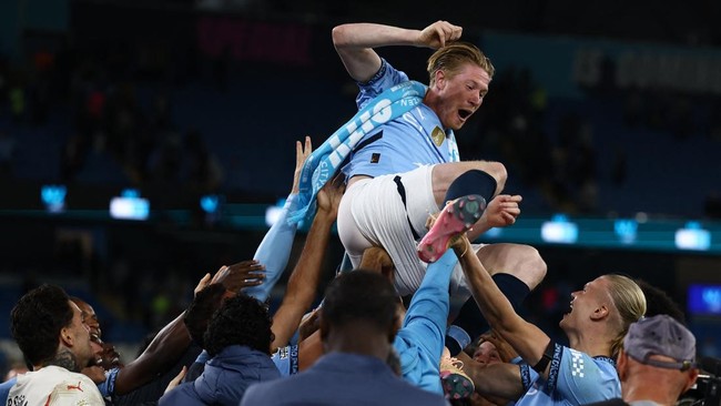 Momen haru itu berakhir dengan para pemain City mengangkat De Bruyne ke udara. Mereka resmi melepas sang kapten dari Etihad.