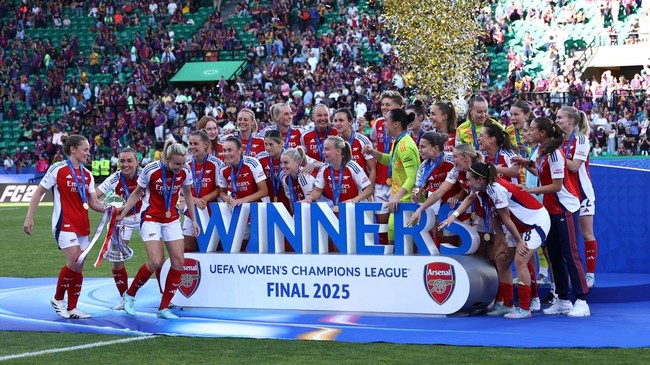 Tim putri Arsenal mengalahkan Barcelona di final Liga Champions Wanita. Datang sebagai underdog, Arsenal menang 1-0 atas Barcelona, yang juara tiga kali dalam empat musim terakhir, dalam pertandingan di Estadio Jose Alvalade, Lisbon, Sabtu (24/5/2025).