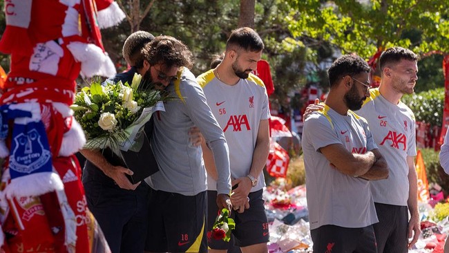 Liverpool mengunjungi tempat karangan bunga mendiang Diogo Jota di depan Anfield. Para pemain The Reds hadir beserta keluarga Jota.