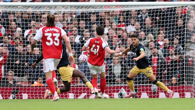 Rice menendang masuk bola sepakan Eberechi Eze yang ditepis kiper West Ham United, Alphonse Areola. Arsenal memimpin 1-0.