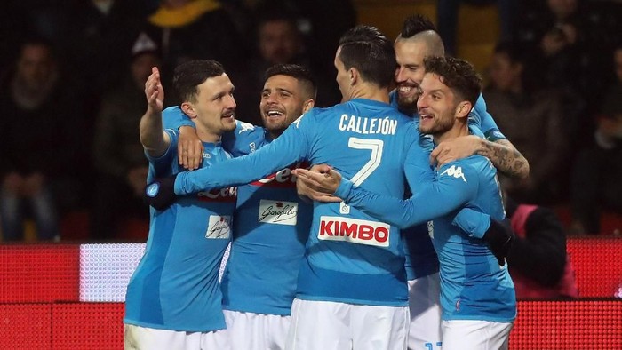 Menerima bola dari Allan, Mertens mengecoh pemain bertahan Benevento sebelum melepaskan sepakan dari sisi kanan kotak penalti yang bersarang di dekat tiang jauh gawang.