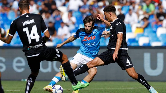 Kali ini, Empadu dan Jakub Kiwior yang dibuat tak berkutik oleh gocekan Kvaratskhelia. Pergerakan apik Kvaratskhelia akhirnya juga tak bisa berbuah gol karena bisa ditangkap Bartlomiej Dragowski.