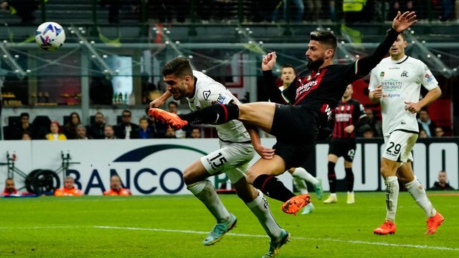 Meski dijaga pemain lawan, Giroud bisa meneruskan bola umpan Tonali dengan sepakan first time kaki kiri. Bolanya masuk dari sudut sempit ke gawang Spezia.