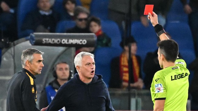 KARTU MERAH! Pelatih Roma, Jose Mourinho, diusir wasit pada menit ke-89. The Special One melakukan protes berlebihan kepada wasit, menyusul pelanggaran Benjamin Tahirovic kepada Nemanja Radonjic.