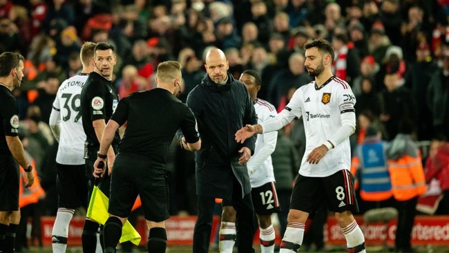 Bruno Fernandes ketahuan mendorong hakim garis saat Manchester United dibantai Liverpool. Akankah Fernandes diskorsing?