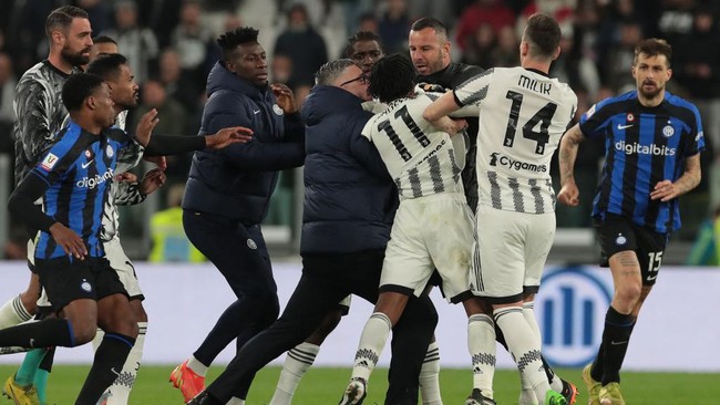 Duel Juventus vs Inter di Allianz Stadium dalam pertandingan leg pertama semifinal Coppa Italia, Rabu (5/4/2023) dini hari WIB lalu, berakhir dengan keributan antarpemain. Itu terjadi tak lama setelah Romelu Lukaku mencetak gol balasan untuk membuat skor jadi imbang 1-1.