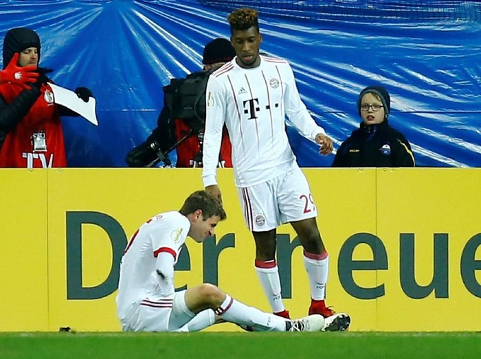 Mueller mengalami cedera paha usai bertabrakan dengan kiper lawan, Michael Ratajczak, dalam proses terciptanya gol pertama Bayern yang dicetak oleh Kingsley Coman di menit ke-19.
