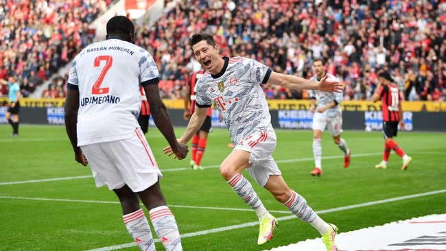 Baru tiga menit pertandingan berjalan, Bayern sudah unggul. Umpan silang Dayot Upamecano disontek Robert Lewandowski dengan tumit untuk menaklukkan Lukas Hradecky.