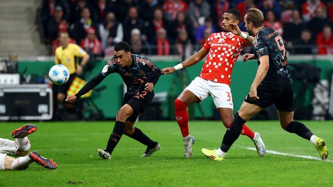 Bayern Munich menang mudah 4-0 di kandang Mainz pada pertandingan babak kedua DFB-Pokal. Jamal Musiala jadi bintang kemenangan Bayern dengan mengemas hat-trick.