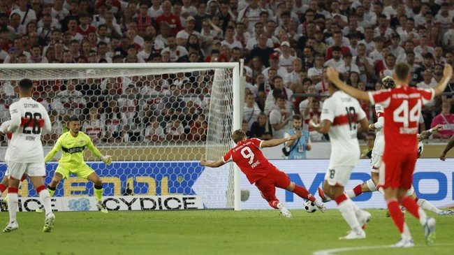 Stuttgart akhirnya mencetak gol balasan. Leweling menipiskan skor 1-2 di injury time.