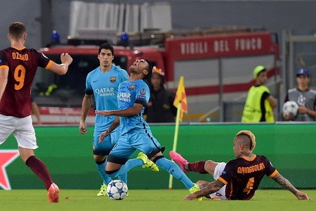 Rafinha ditandu keluar lapangan saat Barcelona bermain imbang 1-1 dengan AS Roma di Liga Champions, Rabu (16/9/2015). Pemain berusia 22 tahun itu terkapar usai mendapatkan tekel dari Nainggolan. Dia akhirnya tak bisa meneruskan laga dan digantikan oleh Javier Mascherano.
