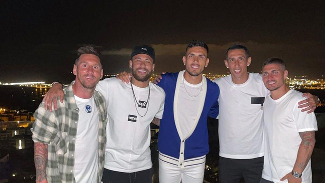 Yang jadi sorotan, Messi jadi satu-satunya pemain yang bukan penggawa PSG di foto tersebut. Dia berfoto bersama Neymar, Leandro Paredes, Angel Di Maria, dan Marco Verratti.