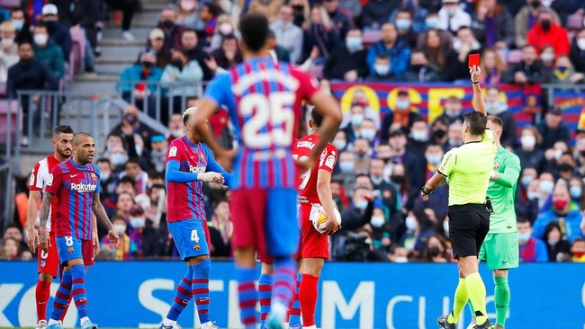 Sayang sekali, tidak lama kemudian Dani Alves diacungi kartu merah oleh wasit Jesus Gil Manzano usai memeriksa pelanggaran itu melalui VAR. Alves mesti meninggalkan area permainan lebih awal setelah menerjang betis Carrasco.