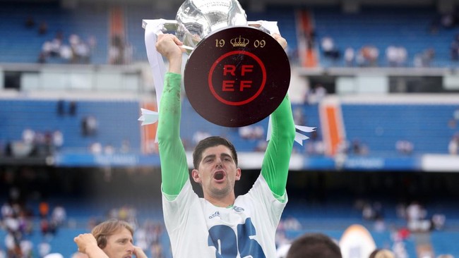 Thibaut Courtois merayakan gelar juara Liga Spanyol yang diraihnya bersama Real Madrid. Kiper Los Blancos itu juga menyindir tim rival, Barcelona. Apa katanya?