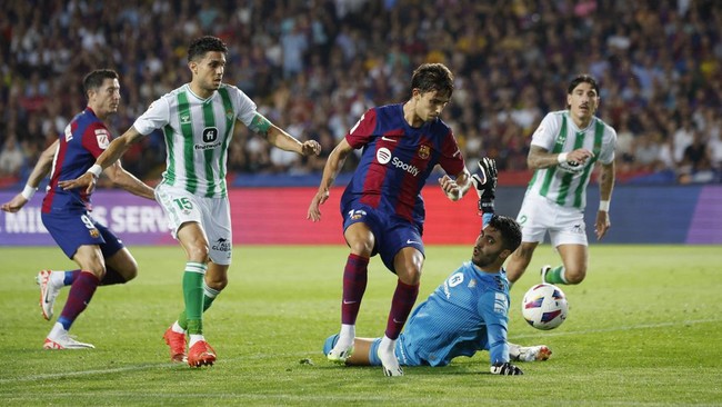 Barca menjamu Real Betis di Stadion Olimpic Lluis Companys, Minggu (17/9/2023) dinihari WIB. Gol-gol kemenangan Barca diciptakan oleh lima pemain yang berbeda; Joao Felix, Robert Lewandowski, Ferran Torres, Raphinha, dan Joao Cancelo.