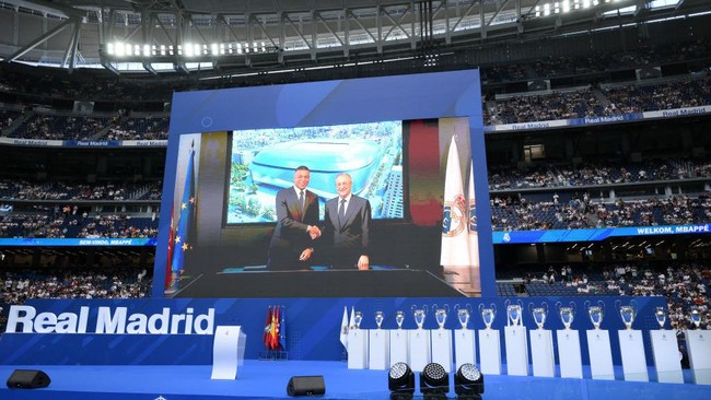 Lokasi pekenalan Mbappe berlangsung di Santiago Bernabeu, Selasa (16/7/2024) sore WIB. Mbappe dan presiden Florentino Perez duduk bersebelahan untuk saling menandatangani kontrak kesepakatan.