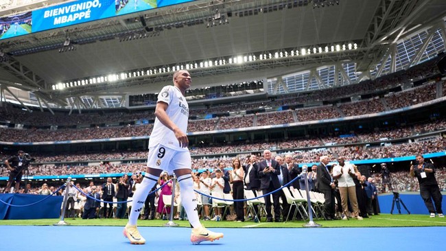 Presentasi perkenalan Mbappe dilakukan Selasa (16/7) di Santiago Bernabeu. Dia memasuki lapangan dengan jersey Real Madrid bernomor punggung 9.