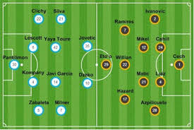 Awalnya Pellegrini menempatkan Jovetic sedikit lebih di belakang Dzeko yang berdiri paling dengan. David Silva, Toure dan Milner bergerak dari tengah untuk menyuplai bola ke daerah pertahanan Chelsea. Sedangkan Javi Garcia bertugas untuk menjaga dari tengah saat Toure mulai meninggalkan posisinya saat menyerang.