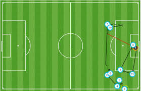 Setelah pemain sayap United memaksa garis pertahanan lawan turun, United lalu mengembalikan bola ke area tengah, sementara pemain depannya merangsek untuk mendekati garis gawang.