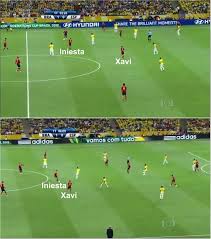 Scolari juga memerintahkan para pemainnya untuk terus memberikan tekanan kepada otak serangan Spanyol, yang ketika itu diperankan oleh Xavi dan Iniesta. Pada gambar di bawah, terlihat para pemain Brasil yang berdiri sangat rapat di depan area kotak penalti dan tidak melepaskan perhatian mereka dari kedua pemain andalan Barcelona itu.