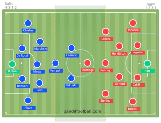 Menghadapi Italia, Inggris harus tampil hati-hati. Rasanya Hodgson tidak akan mau mengambil risiko dengan permainan yang terlalu menyerang. Jadi, formasi 4-2-3-1 menjadi pilihan yang bijak untuk Inggris pada pertandingan ini. Suka ataupun tidak, Inggris masih akan mengandalkan Wayne Rooney yang telah berpengalaman di ajang Piala Dunia.