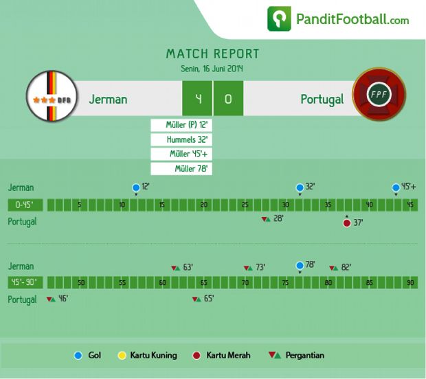 Pertemuan keempat antara Portugal dan Jerman kali ini sejatinya berakhir sejak menit ke-36, saat dikartu merahnya Pepe. Unggul jumlah pemain membuat Jerman lebih leluasa dalam mengontrol permainan. Unggul 3-0 saat jeda dengan lawan hanya bermain 10 pemain membuat Jerman bisa bermain lebih rileks di babak II.