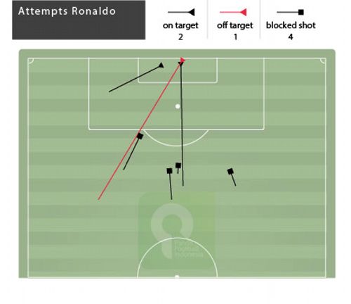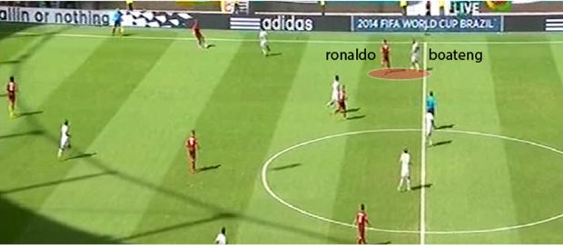 Dan pilihan taktikal ini terbukti vital dalam mengunci keganasan Portugal yang mengandalkan Ronaldo di kiri dan/atau Nani di kanan. Sepanjang pertandingan Ronaldo kesulitan mendapatkan kesempatan untuk melakukan tembakan ataupun memiliki ruang untuk mengeluarkan dribbling magisnya. Ia lebih sibuk menghindari Boateng yang sering menguntitnya ketika pemain terbaik dunia ini melakukan pergerakan tanpa bola. (Lihat grafis di atas)