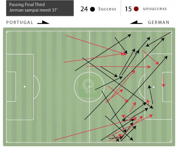 Produksi umpan Jerman di final-third [lihat grafis di bawah] sebelum Pepe menerima kartu merah memperlihatkan bagaimana mereka sulit memasuki pertahanan Portugal lewat umpan-umpan pendek. Jerman hanya bisa memperagakan hal itu di kedua sisi lapangan, khususnya di sisi kanan penyerangan yang ditempati Oezil.