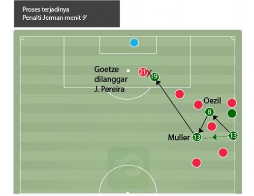 Dengan memanfaatkan sedikit celah, ketiganya melakukan umpan-umpan pendek dan berakhir dengan penalti karena Goetze dilanggar Joao Pereira. Trio Goetze-Oezil-Mueller mampu membuat bek Portugal kebingungan dalam melakukan penjagaan. Goetze yang area bermainnya di sisi kiri, masuk ke jantung pertahanan, sehingga posisinya rapat dengan Mueller.