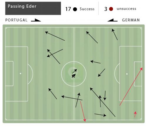 Elder berada di belakang Ronaldo ini bisa dibaca sebagai bagian upaya Bento untuk tetap merapatkan pertahanan. Saat Jerman membangun serangan, Eder diinstruksikan untuk mundur dan melindungi area depan kotak penalti. Grafis Eder di bawah ini menunjukkan area bermainnya yang bahkan sampai ke wilayah pertahanan sendiri.