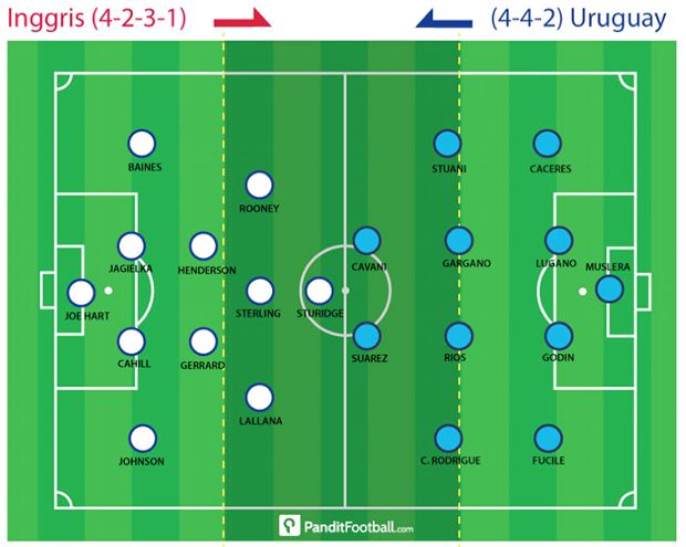 Terlihat saat melawan Kosta Rika, lapangan tengah Uruguay menjadi area yang sangat rawan untuk dieksploitasi lawan. Joel Campbell telah menunjukan bagaimana dia bisa memanfaatkan ruang terbuka antara gelandang dan barisan pertahanan Uruguay. Inggris juga tentu memiliki banyak pemain yang melakukan hal yang serupa dengan Joel Campbell.
