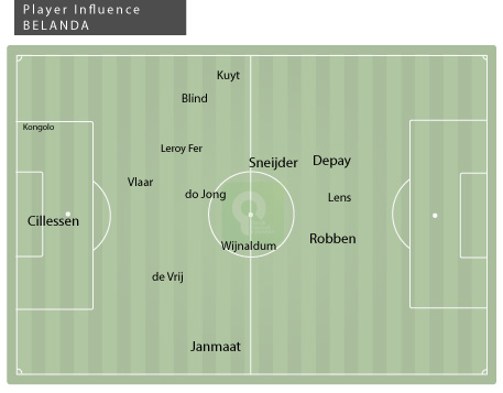 Absennya Indi sempat menjadi sorotan pada awal laga, namun dengan jeniusnya van Gaal mentransformasikan Kuyt untuk menjadi wingback kiri yang pada pertandingan ini banyak menghabiskan waktu di area defensif Belanda untuk membantu Blind menjinakkan Isla.